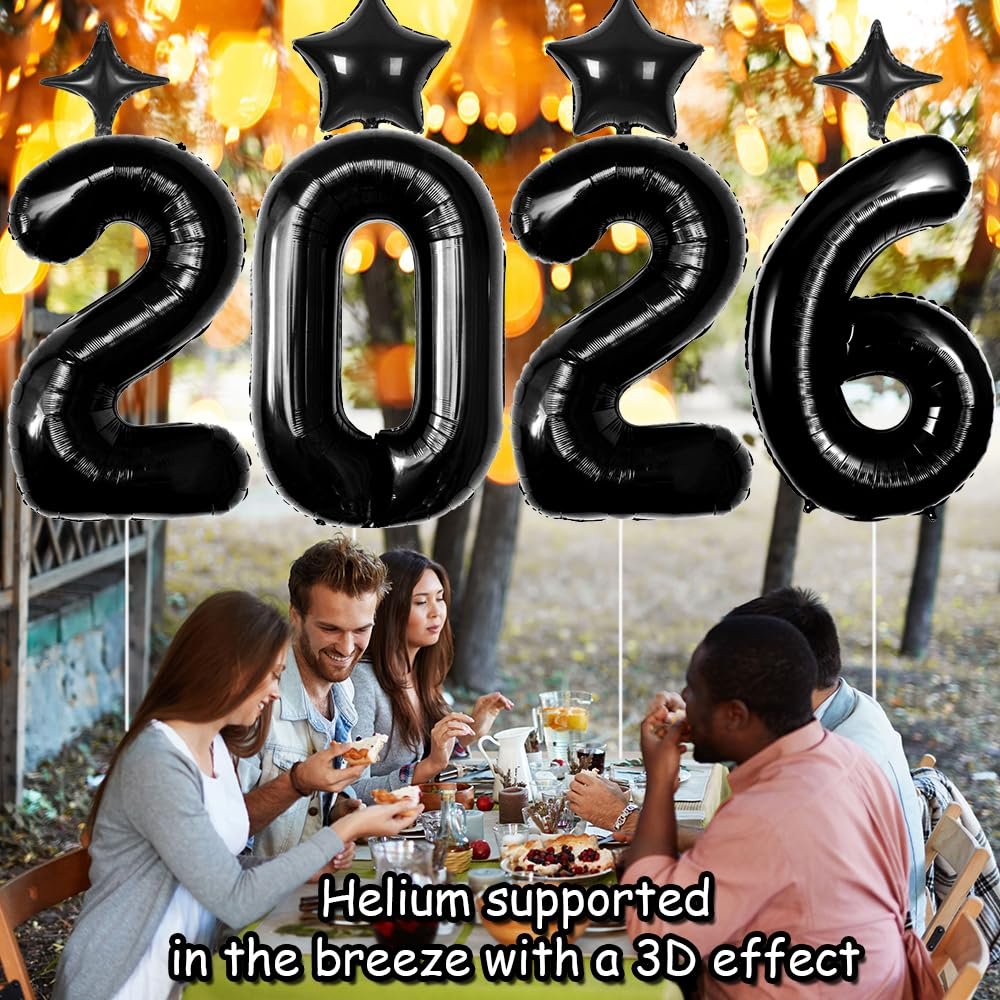 - 🎉【2026 Black Balloons Design】Our Black 2026 foli balloons includes 42inch Number 2026 Balloons, 2pcs 18″ pentagram Black balloons, 2pcs 10″ four-pointed star Black balloons,2pcs Inflatable Straws, 20pcs glue dots, 32ft Ribbon. They are perfect for creating a memorable Gwraduation celebration. The Black foil finish adds a touch of elegance that will surely impress your guests.
